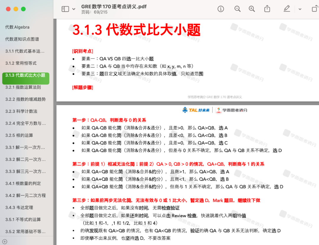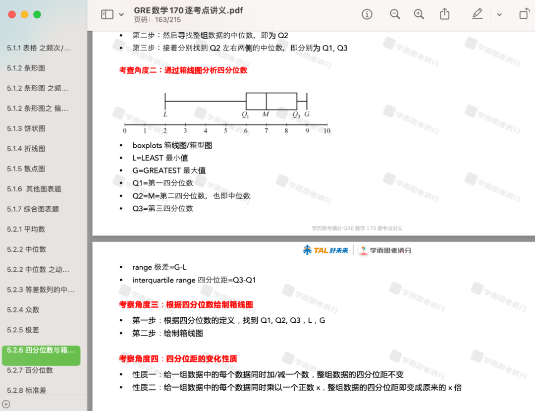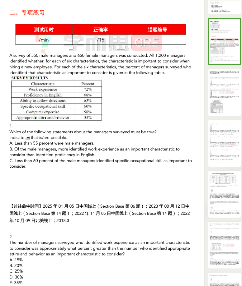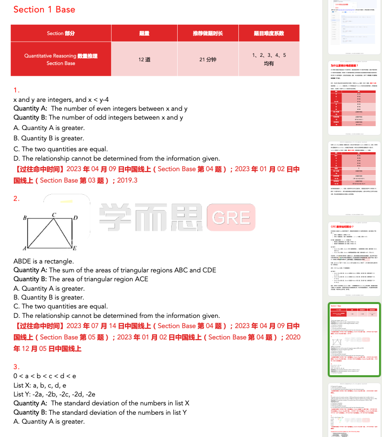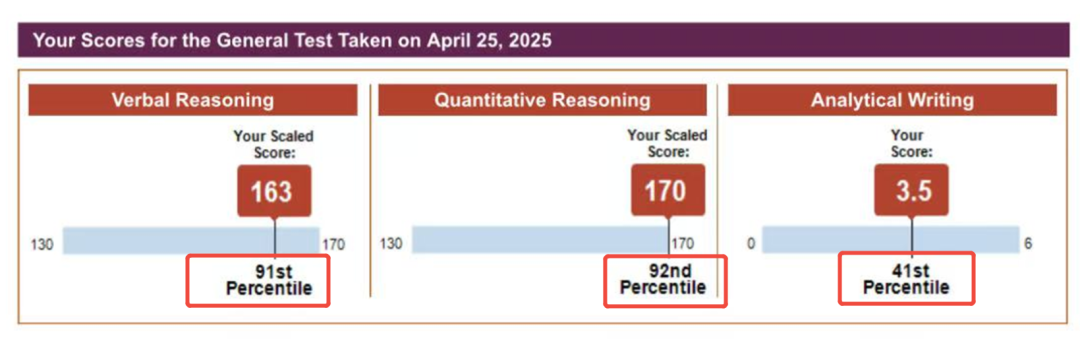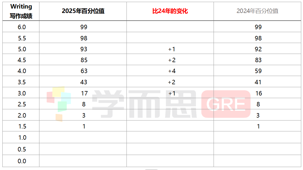 刚刚,ETS发布了2025年最新版的GRE成绩百分位值表。什么是百分位数?简单来说,百分位值表示你的成绩在所有GRE考生中的排名位置,比如——百分位值为91,代表你超过了全球91%的GRE考生; 随着GRE考试的题库与考题难度每年持续变化,同一个GRE成绩在不同年份对应的百分位值也会不断变化。因此,为了更好把控你的真实实力,很多学校在官网上不会提供确切的GRE成绩要求,而是会提到录取学生在百分位排名中的位置。 因此,一定程度上GRE成绩对应的百分位值的参考价值甚至比具体分数更重要!它能更直观地反映你在全球考生中的实时表现。 接下来,就让小思带着同学们一起来看一看最新的GRE语文、数学、写作成绩百分位值变化趋势吧~ 01 但是,同样是Verbal 156分,去年是超过全球69%的考生,今年已经可以超过了全球70%的考生,比原来多了1%。 总结来说,2024~25年间全球考生的GRE语文成绩水平基本维持不变,只有个别分数拿到手的考生更少了,因此对应的百分位值有些微+1。 对于任何一位考生来说,如何掌握核心解题技巧、在考试中脱颖而出仍是关键。面对这样看似“温和”的竞争环境,真正的挑战在于提升自身能力,准确定位高效的备考策略。 02 当你今年在Quant科目考了168分,对应百分位值81 percentile,意味着你的分数超过了全球81%的考生,而去年是超过全球83%的考生,比原来少了2%。 类似地,当你今年在Quant科目考了166分,对应百分位值71 percentile,意味着你的分数超过了全球71%的考生,而去年是超过全球74%的考生,比原来少了3%。 为了帮助同学们更加高效率备考,尤其是朝着GRE数学满分的目标冲刺,我们为大家汇总了以下2025年最全GRE数学备考最全PDF资料10+份,100%覆盖你的所有需求,趁早上岸GRE数学考试! 是的,你没有听错!过去多年以来,学而思考满分GRE数学教研组已经持续收集整理了10000+道GRE机经真题!通过详细爬梳所有题,我们发现,GRE数学考来考去,其实只有170个知识点。 每次GRE考试无论线上线下无论国内国外,都是从以上170个考点当中随机挑选30个左右考查。为了帮助大家高效率完成GRE数学的备考,我们特意制作了《学而思GRE数学170逐考点讲义&核心母题800道》。 170逐考点下,我们都为大家精心汇总了相关的解题技巧、解题套路、必备性质与规律。讲义总页数达到了215页,讲义总字数已经超过了22万+!只要上考场前,提前就掌握了这些内容,那么考场100%都是已经学过的考点,不会存在任何新考法! ▲上下滑动查看更多 点击下方图片 即可一键获取所有资料 特别是对于中文背景GRE数学考生来说,很多数学术语中文怎么讲是知道的,但是英文如何描述,可能存在很多地方不清楚。为此,我们制作了《GRE数学常用术语表》PDF,汇总了最全GRE数学必背术语,帮助大家集中记忆、背诵、熟悉各项GRE数学术语。 但是,只背完GRE数学术语,还是会有很多同学读!不!懂!题!目!什么原因?很可能是对一些常用的数学表述不清楚,造成无法理解题目意思。为此,我们制作了《GRE数学常用表述表》PDF,积累了最全GRE数学常见句型表述,帮助大家集中学习了解这些表述,为清晰、准确理解题目奠定扎实基础。 很多GRE数学涉及的公式,都是很多我们中文背景同学小学数学、初中数学、或者高中数学阶段学习过的,早已经忘记。如何集中学习掌握记忆这些公式?如何避免遗漏,100%掌握真正对解决GRE数学题有帮助的公式?如何避免超纲内容,真正了解GRE考试所考察的公式? 为此,学而思GRE老师制作的这份《学而思GRE数学公式表》PDF文档,旨在帮助大家唤醒回忆,集中复习回顾这些对于GRE数学备考过程中,不可或缺的GRE数学公式。 此外,GRE数学还会考查大家是否还记得一些可以用于快速解题性质。如何系统梳理这些关键性质?如何确保无遗漏地掌握GRE实际考查的所有数学性质?如何精准区分高频考点与超纲内容?为此,学而思GRE教研团队特别编写《学而思GRE数学性质表》PDF,通过分类整理数学对象的本质特征与运算规律,帮助考生快速激活数理思维记忆,高效掌握GRE数学题型背后真正需要运用的性质定理体系。 GRE数学几何示意图中哪些信息可以采信?GRE数学考虚数嘛?between 3 and 8包括两端吗?GRE数学出题人默认的一些GRE出题常识有哪些?只有清楚知道以上问题的答案,你才能避免一些GRE数学解题的技术性问题。为此,我们制作了《GRE数学出题常识》PDF,帮助大家提前排坑。 进入做题、计算环节,很多同学对于计算器什么时候使用,怎么使用,如何输入数字,存在各种各样的问题,为此,我们根据ETS官方说明,制作了《GRE数学考场计算器指南》PDF,详细说明解释了计算器使用的各注意事项。 何谓“脏题”?“脏题”是指那些因其复杂性和繁琐步骤而让人头疼的题目。虽然这些题目看起来极为麻烦,但对于已经做好充分准备的你来说,它们正是你展示实力的最佳机会。为了帮助你应对这些棘手问题,我们从学而思GRE万题库中精选出170道“脏题”,一一击破。这些题目虽然复杂,但提前练习可以让你在考试中游刃有余。 图表题,在GRE数学Section Base12题中有3道,占比1/4,这类题如果不提前掌握解题套路,适应长题干考法,很可能在考试过程当中占用大量时间,影响做题节奏,甚至造成错误量超过4+,无法成功进入Section自适应Hard。 为此,我们为大家汇总了《学而思GRE数学图表题专项练习》,每个Section包含3张图片,涉及9道图表题, 帮助大家集中训练好这