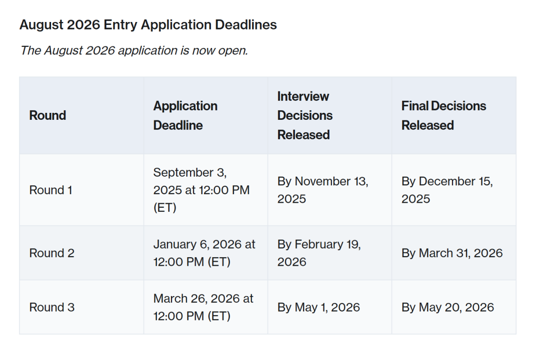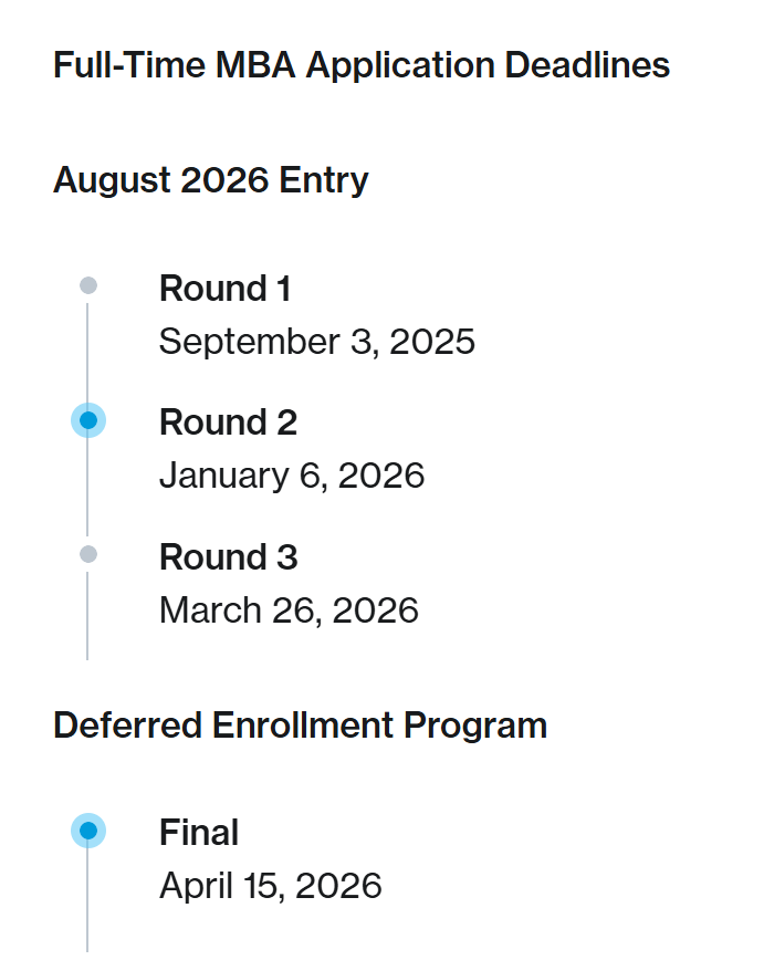 工商管理硕士项目(MBA)第1轮申请现已结束;第2轮申请现已开放,截止日期为2026年1月6日。