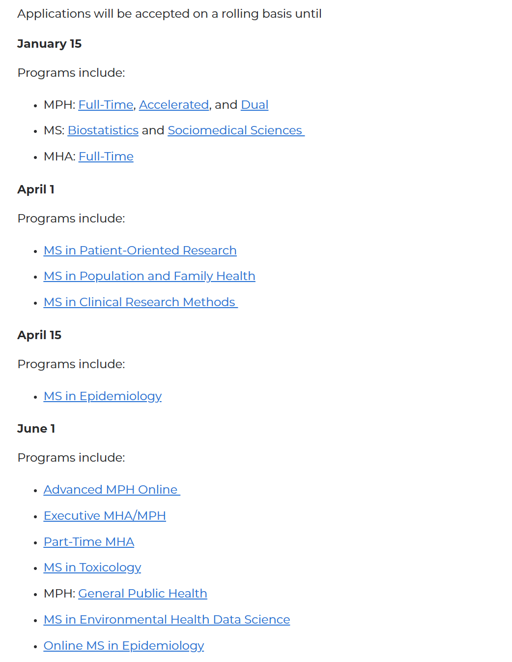 哥伦比亚大学公共卫生学院2026fall的硕士专业申请项目截止日期如下: