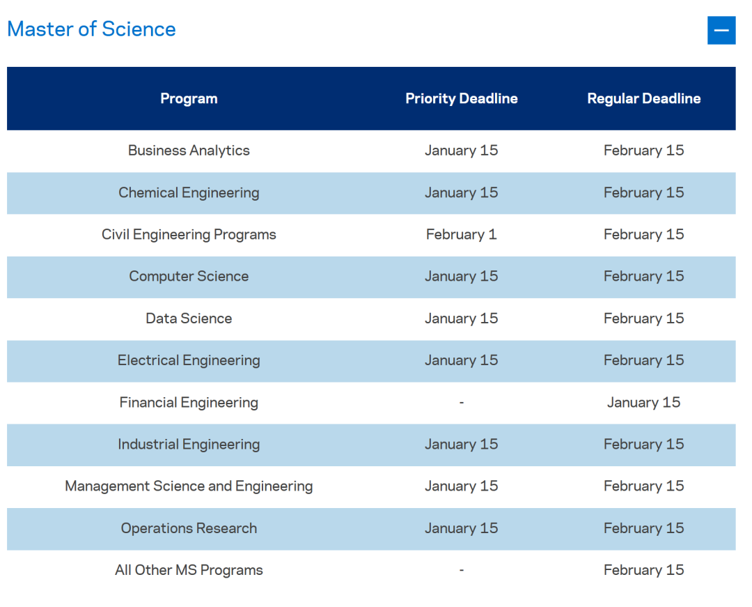 哥伦比亚大学工程学院 (Columbia Engineering)的硕士专业申请截止日期如下: