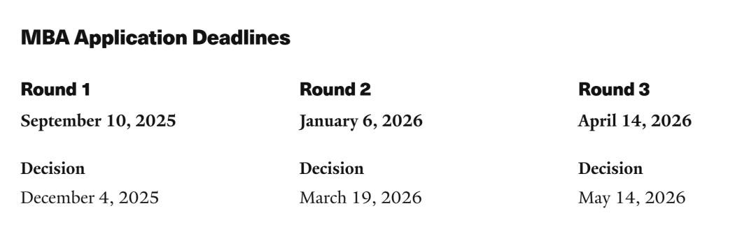 MBA(工商管理硕士)项目的一轮申请截止日期为:2025年9月10日,决定日期为2025年12月4日;二轮申请截止日期为:2026年1月6日,决定日期为2026年3月19日;三轮申请截止日期为2026年4月14日,决定日期为2026年5月14日。