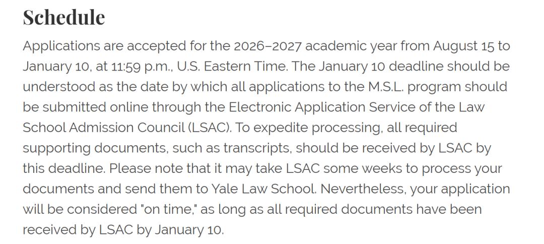 法学院(Yale Law School)申请接受时间为 2025 年 8 月 15 日至 2026年 1月 10 日。所有必需的支持文件(例如成绩单)都必须在此截止日期前提交给 LSAC(法学院招生委员会)。请注意,LSAC 可能需要几周时间才能处理文件并将其发送到耶鲁法学院。尽管如此,只要 LSAC 在 2026年1 月 10 日之前收到了所有必需的文件,申请就会被视为“按时提交”。
