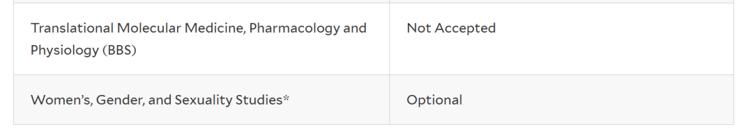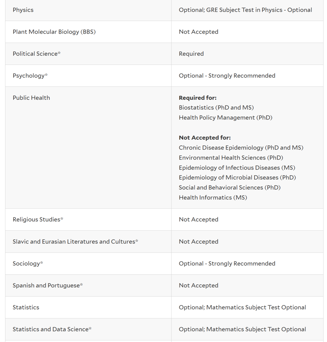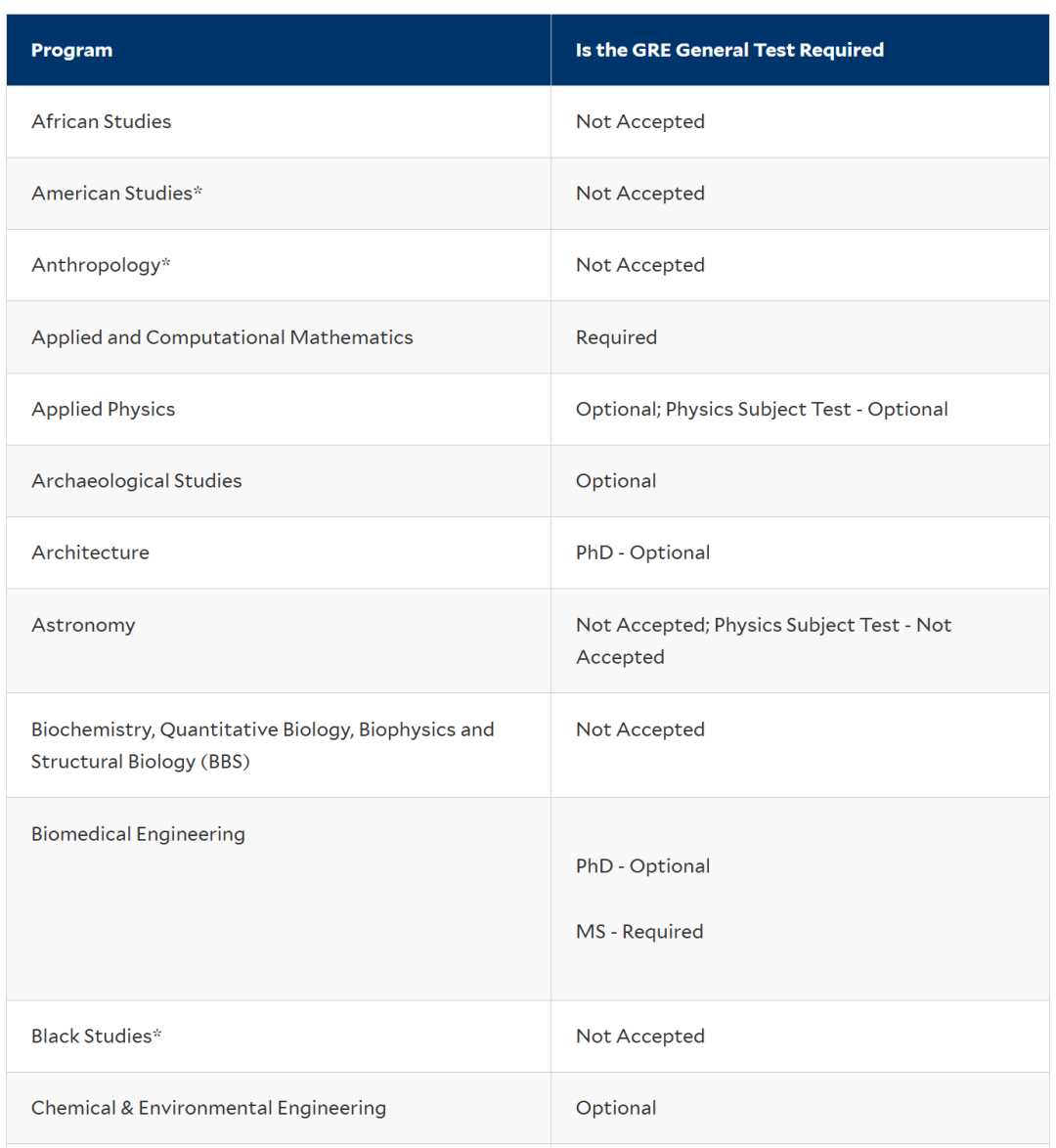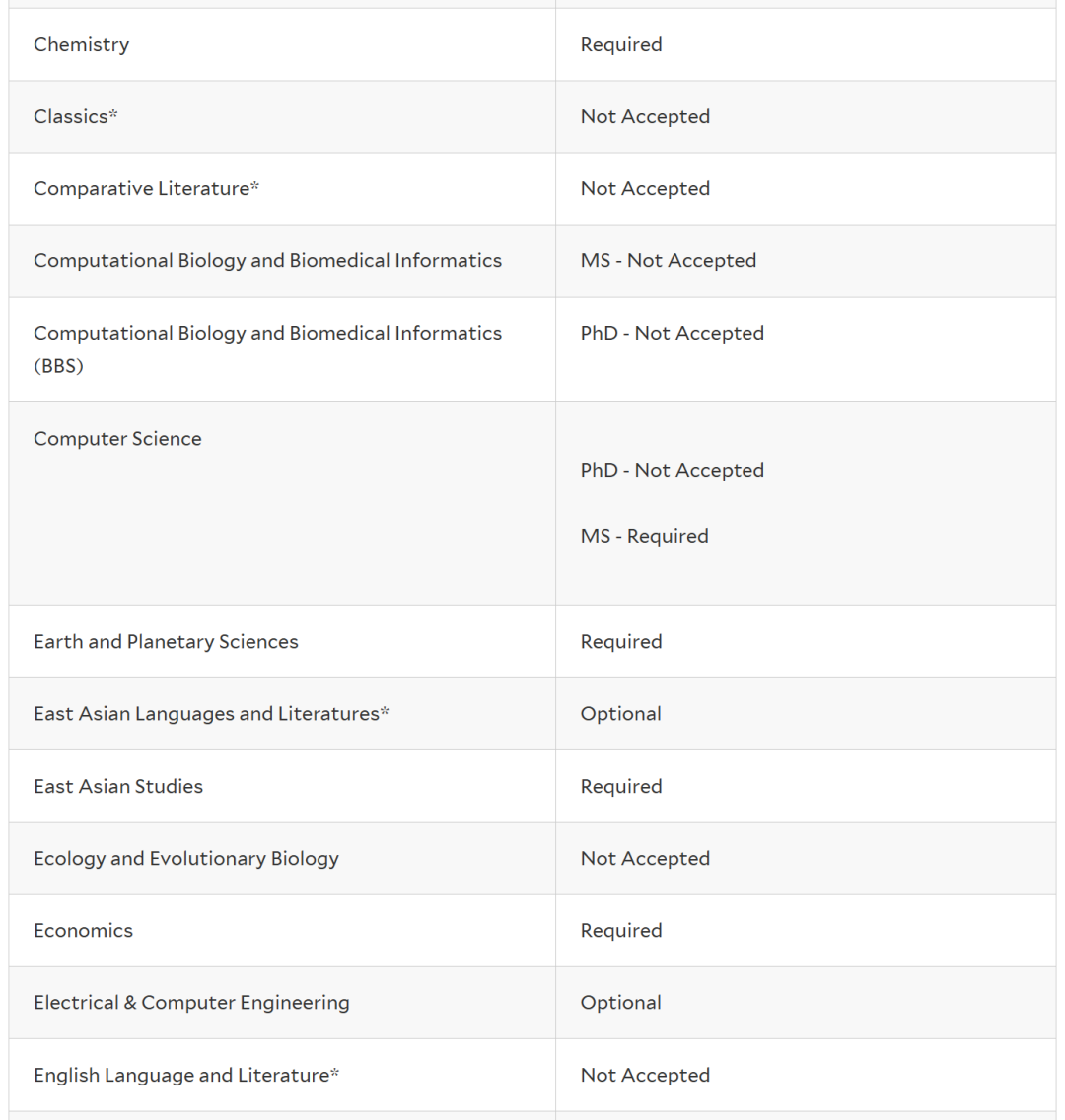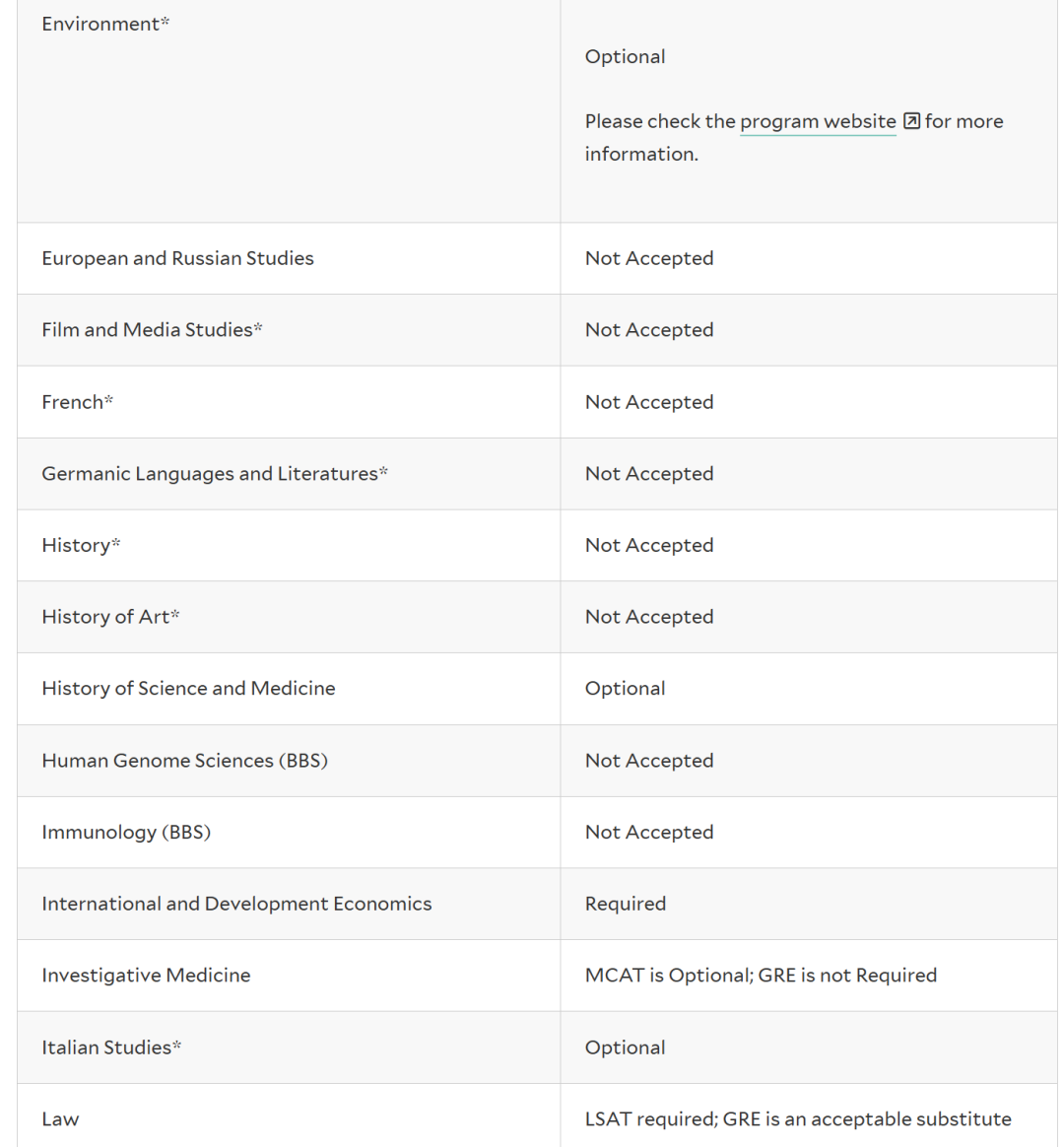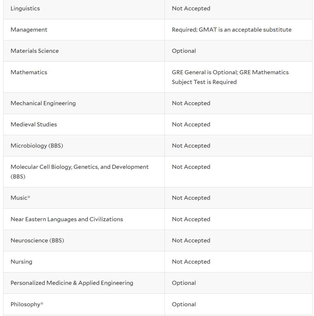 此外,还有很多同学比较关注的还有:申请Yale是否必须提交GRE成绩?根据Yale官网信息,不同项目的要求的确不太一样。既有必须提交的,也有可选(Optional),也有推荐提交的。以下为各项目是否需要提供GRE成绩的汇总信息。