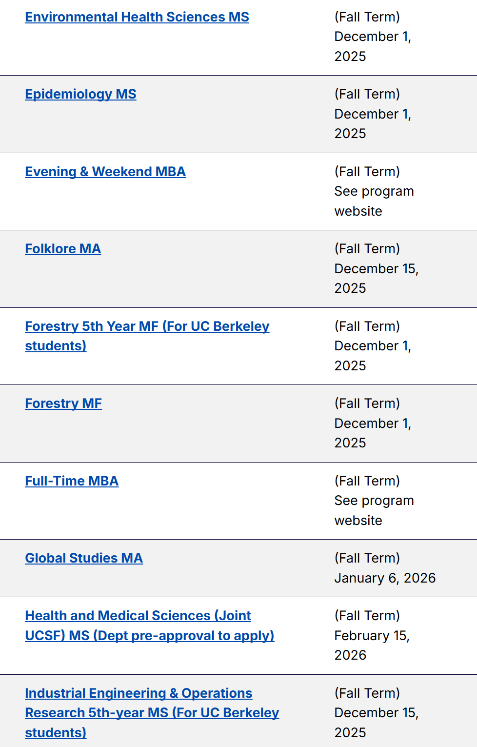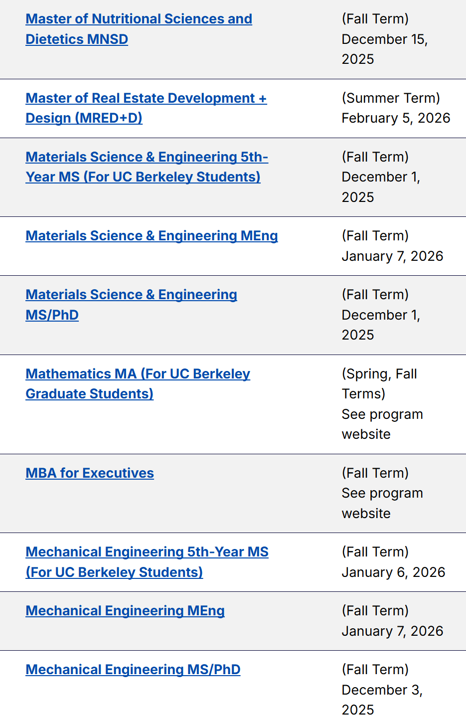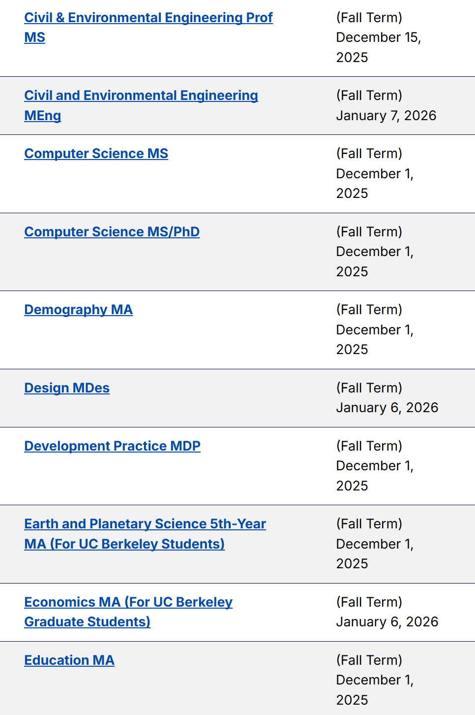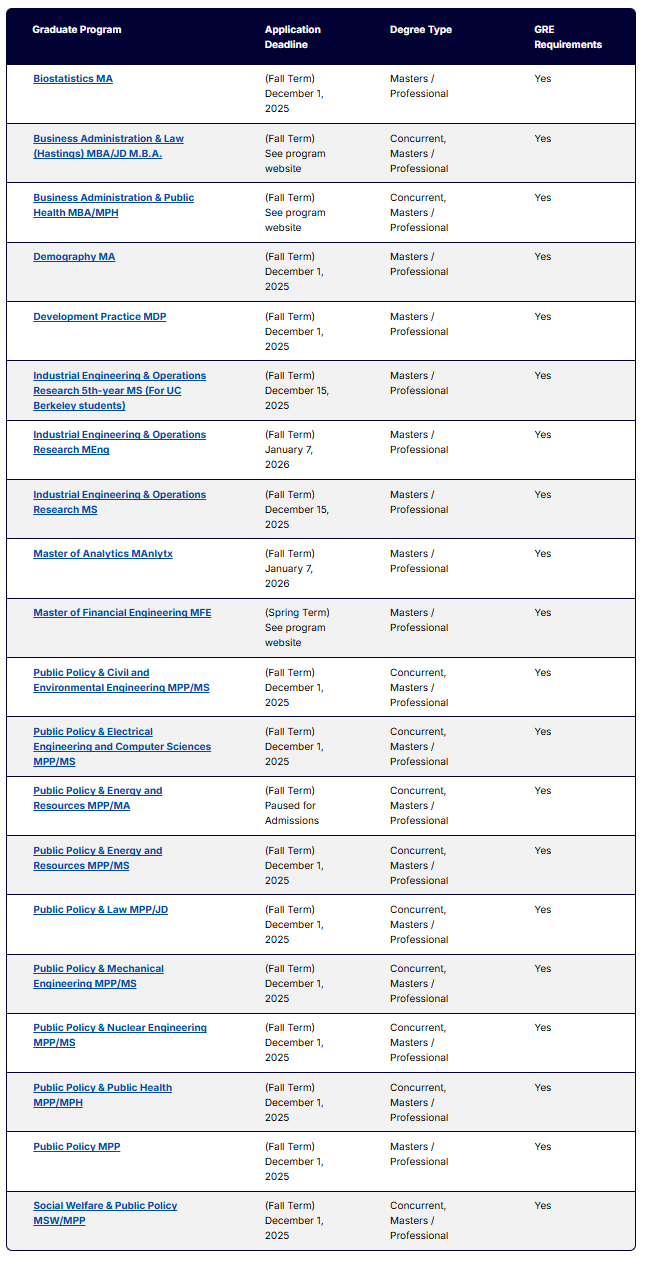 以下为各项目申请截止日期的汇总信息。对于一些官网尚未更新的截止日期,大家可以自行把年份+1,由此可以大致推算得出26 fall UCB不同专业的预计申请截止日期~等官网更新后,我们也会为大家第一时间更新~