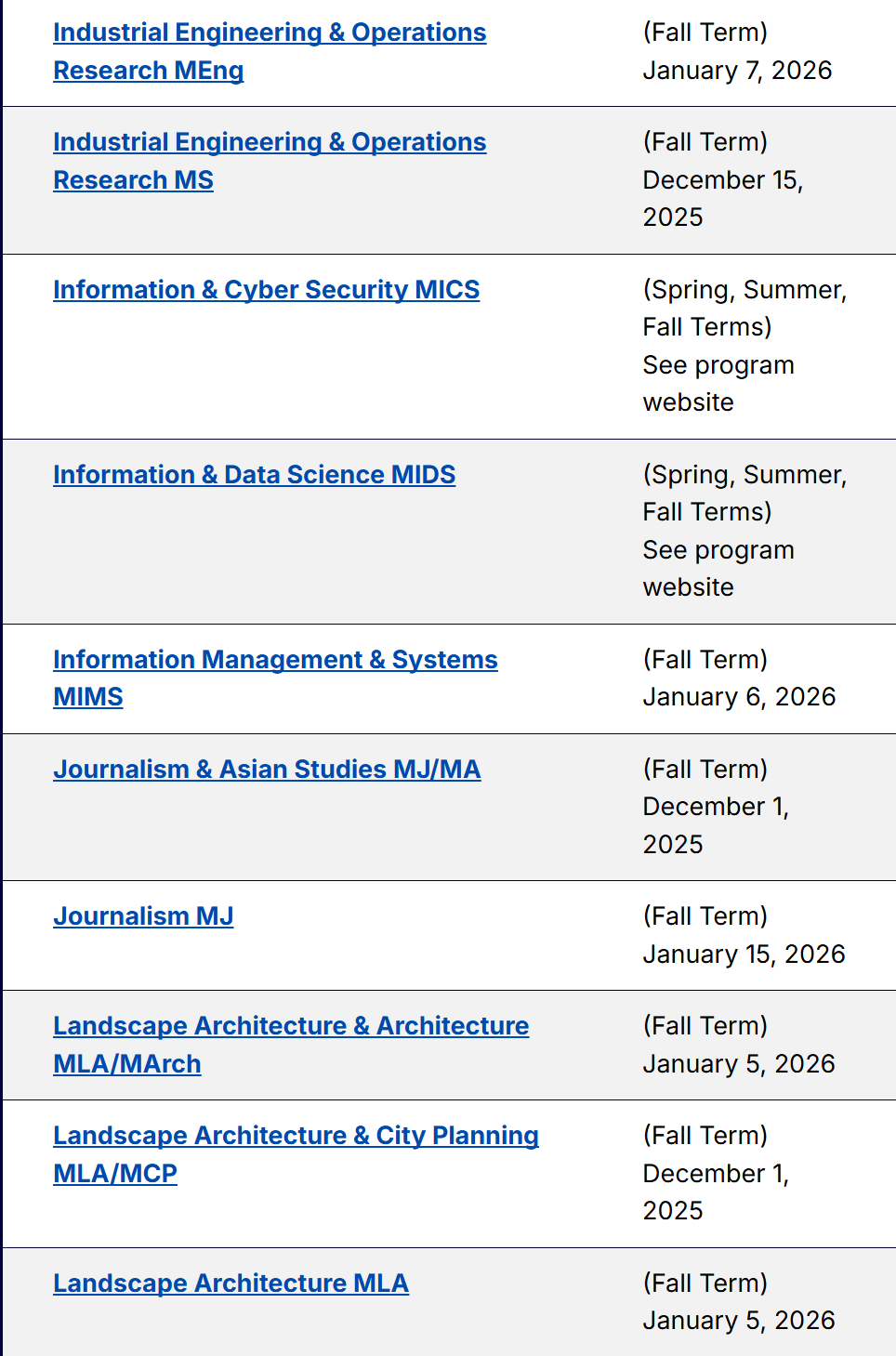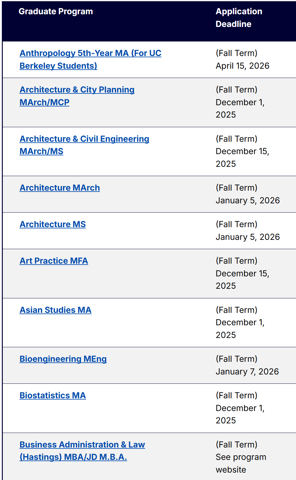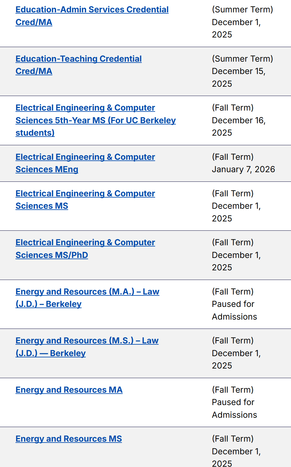 以下为各项目申请截止日期的汇总信息。对于一些官网尚未更新的截止日期,大家可以自行把年份+1,由此可以大致推算得出26 fall UCB不同专业的预计申请截止日期~等官网更新后,我们也会为大家第一时间更新~