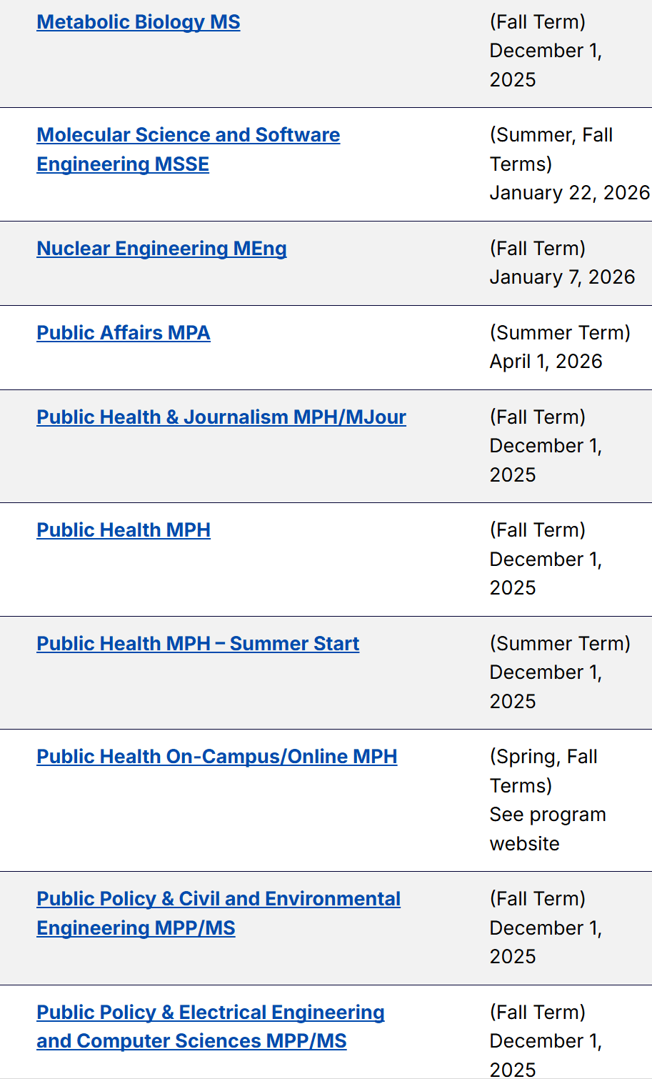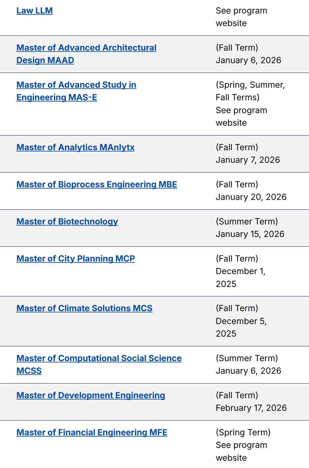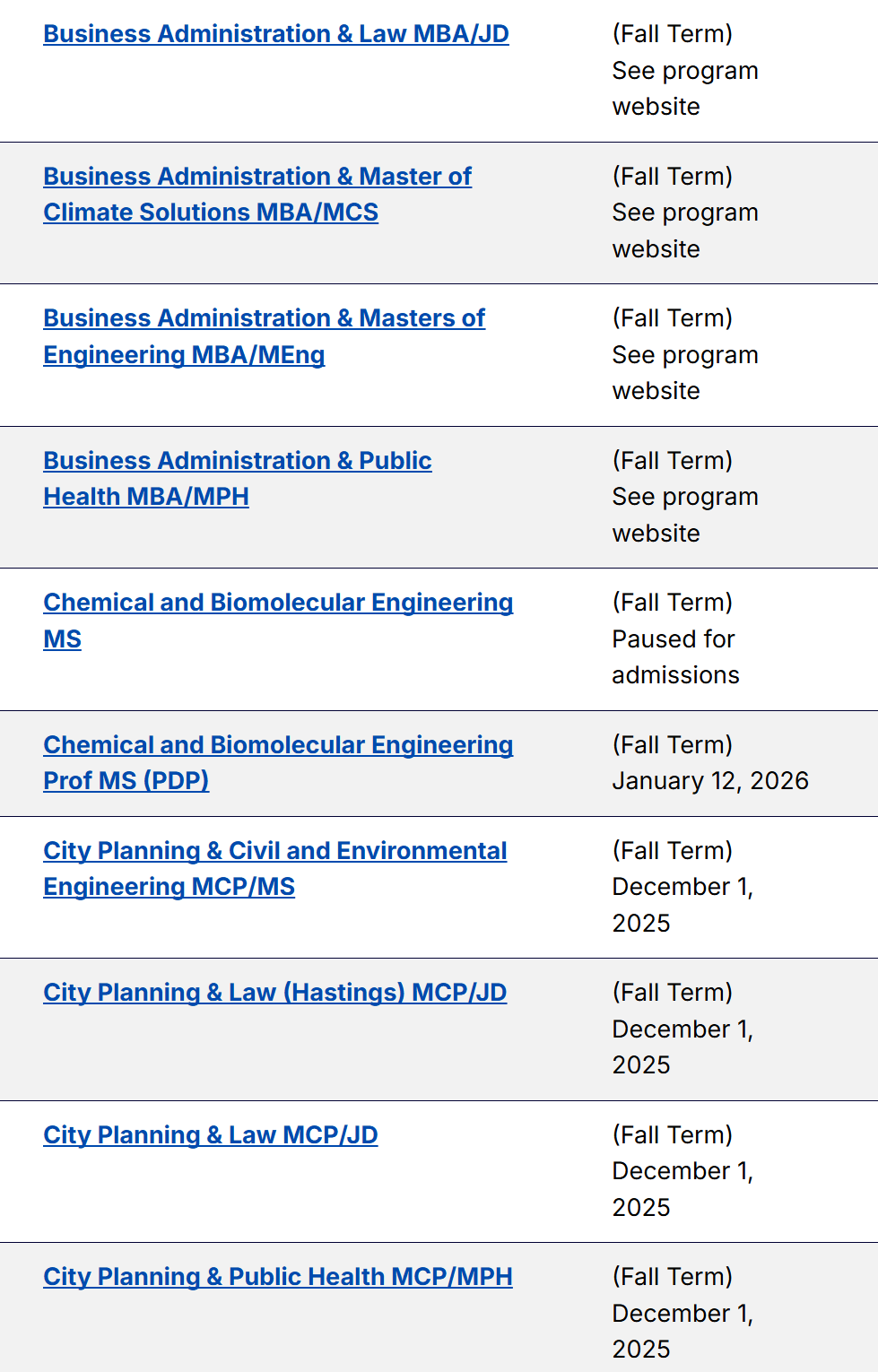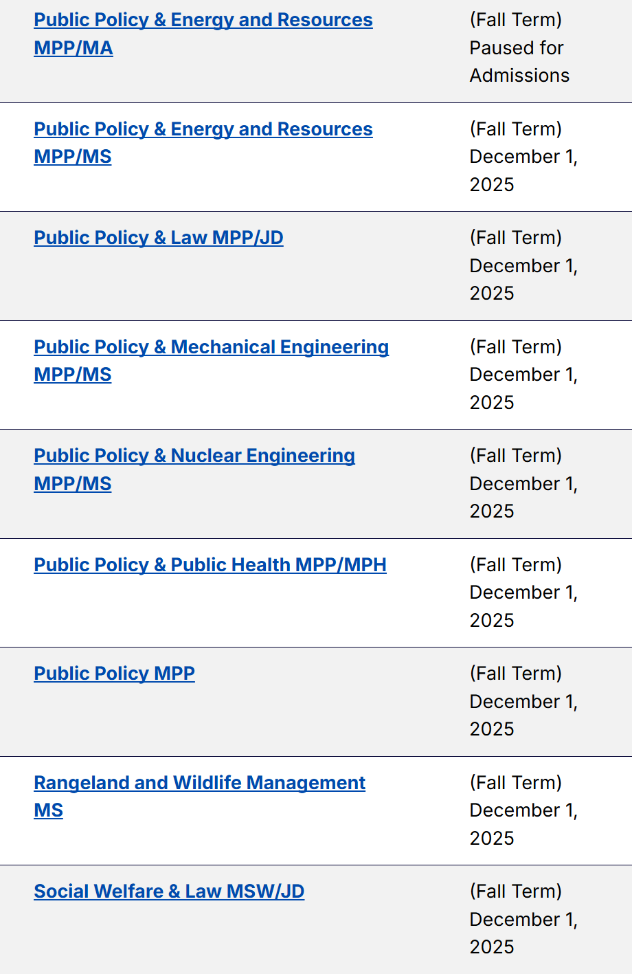 以下为各项目申请截止日期的汇总信息。对于一些官网尚未更新的截止日期,大家可以自行把年份+1,由此可以大致推算得出26 fall UCB不同专业的预计申请截止日期~等官网更新后,我们也会为大家第一时间更新~