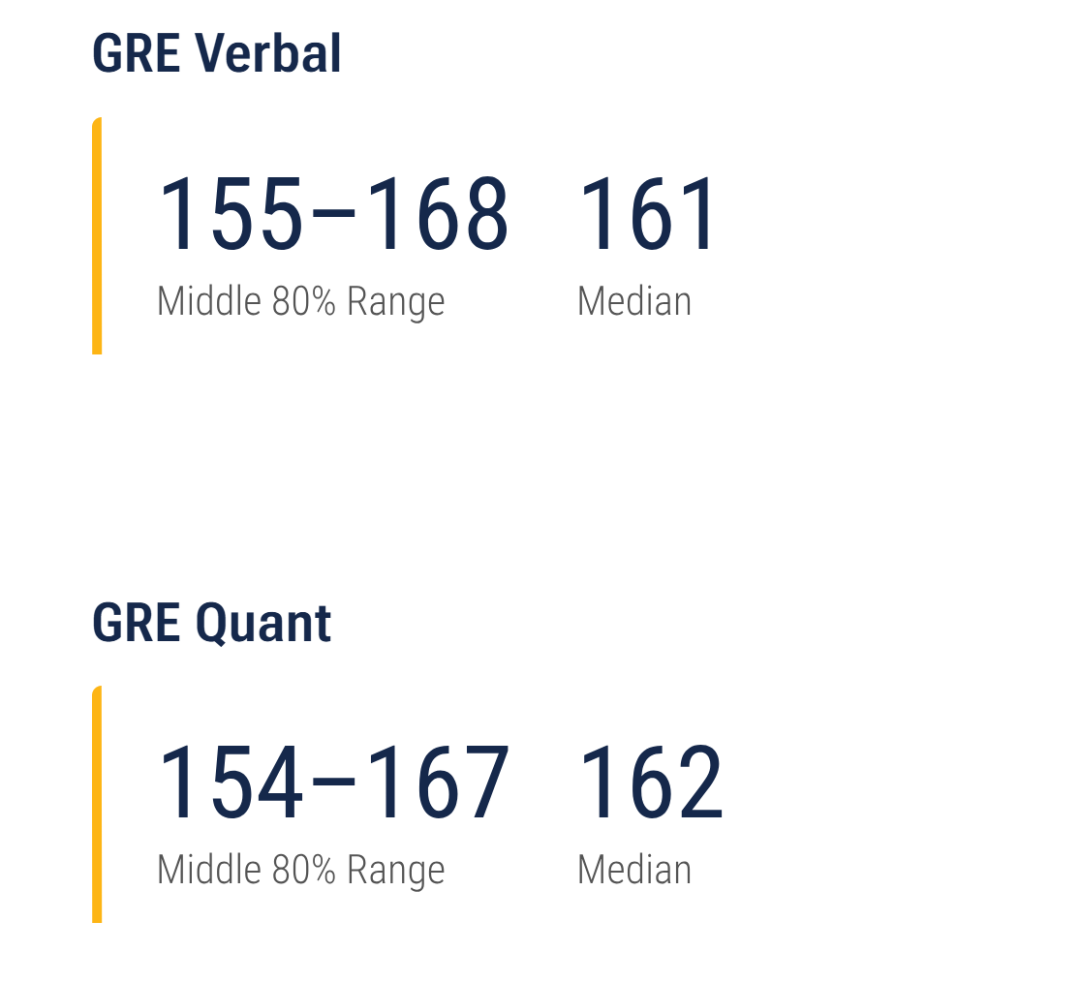 注意:middle 80% range的意思是,排除录取分数最低的10%,以及录取分数最高的10%,只展示了剩下中间80%录取学生的GRE成绩。