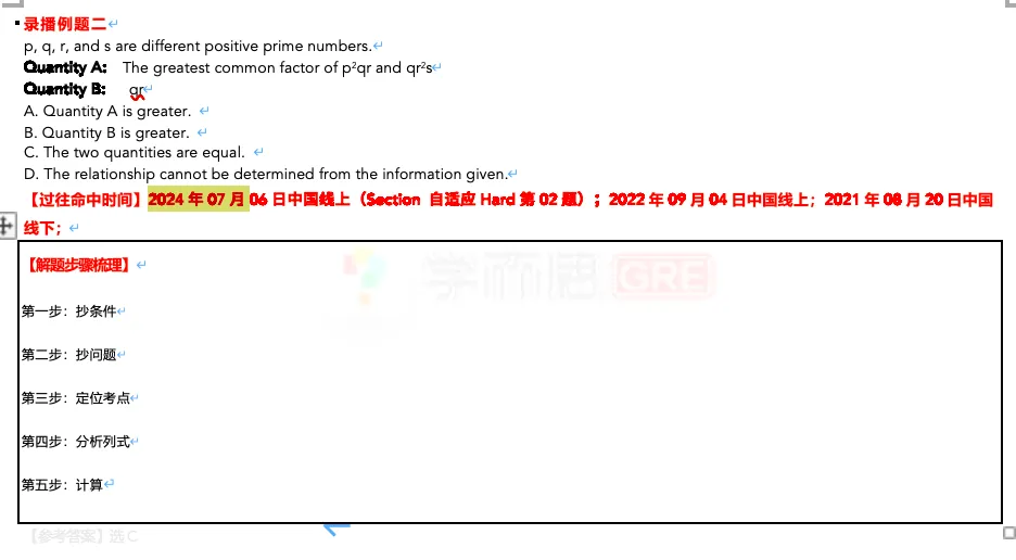 GRE资料满天飞的时代,大家非常容易拿到各种各样假的、残缺的、已被淘汰的GRE题目。而在学而思GRE,由于我们的教研团队会持续追踪每道题确切的过往命中时间,你做到的每道题都是经过严格教研的GRE考场原题、真题、真高频题,真核心母题,真机经题。 甚至,在刚刚过去的7月GRE考场上,还有大量同学直接遇到了我们的课程原题!超开心~ 01 遇到直播原题 首先,是直接遇到直播课上的例题原题!因为每道直播例题都是学而思考满分GRE老师根据最新考情筛选出来的核心母题,所以不仅考点具有代表性,而且甚至大家有机会在考场上遇到原题! 比如,在7月12日GRE线下考场,学而思GRE数学定制冲分小班课3.1.3代数式比大小这道直播例题,原题复现!如果没有提前了解这类题的套路,可能现场还需要大量的推理计算。但是,如果提前在直播课上学过了相关的解题技巧,这类题简直可以秒解! 02 遇到录播原题 其次,是直接遇到GRE数学定制冲分小班课程配套的170逐考点录播(总时长超1800分钟)例题原题! 在7月1日GRE考场,学而思GRE数学定制冲分小班课这道录播例题,原题复现 比如,在7月6日GRE考场Section自适应Hard,学而思GRE数学定制冲分小班课这道录播例题,原题复现~ 比如,在7月7日GRE考场,学而思GRE数学定制冲分小班课这道录播例题,原题复现~ 在7月7日GRE考场,学而思GRE数学定制冲分小班课这道录播例题,原题复现~ 在7月7日GRE考场自适应Hard Section,学而思GRE数学定制冲分小班课这道录播例题,原题复现~ 在7月6日GRE考场自适应Hard Section,学而思GRE数学定制冲分小班课这道录播例题,原题复现~ 在7月6日GRE考场,学而思GRE数学定制冲分小班课这道录播例题,原题复现 在7月1日GRE考场自适应Hard,学而思GRE数学定制冲分小班课这道录播例题,原题复现 在7月13日GRE考场自适应Hard Section,学而思GRE数学定制冲分小班课这道录播例题,原题复现~ 在7月5日GRE考场,学而思GRE数学定制冲分小班课这道录播例题,原题复现~ 在7月7日GRE考场,学而思GRE数学定制冲分小班课这道录播例题,原题复现~ 在7月12日GRE考场,学而思GRE数学定制冲分小班课这道录播例题,原题复现 在7月12日GRE考场,学而思GRE数学定制冲分小班课这道录播例题,原题复现 在7月7日GRE考场,学而思GRE数学定制冲分小班课这道录播例题,原题复现 在7月3日GRE考场,学而思GRE数学定制冲分小班课这道录播例题,原题复现 在7月3日GRE考场,学而思GRE数学定制冲分小班课这道录播例题,原题复现 在7月3日GRE考场,学而思GRE数学定制冲分小班课这道录播例题,原题复现 在7月1日GRE考场,学而思GRE数学定制冲分小班课这道录播例题,原题复现 在7月1日GRE考场,学而思GRE数学定制冲分小班课这道录播例题,原题复现 在7月7日GRE考场,学而思GRE数学定制冲分小班课这道录播例题,原题复现 在7月1日GRE考场,学而思GRE数学定制冲分小班课这道录播例题,原题复现 在7月1日GRE考场,学而思GRE数学定制冲分小班课这道录播例题,原题复现 在7月12日GRE考场,学而思GRE数学定制冲分小班课这道录播例题,原题复现 在课程配套的讲义里,每道录播例题都提供明确的过往命中时间统计,因此,你不再是盲目做题,相反,你可以非常清楚知道自己练习的题,是不是GRE真题,是不是高频题,是不是GRE当前考试范围内的真题,是不是真的有助于自己备考GRE。 03 遇到课下专项练习原题 除了命中录播例题,课程配套的专项练习题也是学而思考满分老师从10000+道GRE数学全题库当中仔细筛选出来的核心母题。这些题目既能帮助大家训练举一反三能力,也有机会在考场被随机抽查到原题! 比如,在7月7日GRE考场Section自适应Hard,学而思GRE数学定制冲分小班代数进阶练习9题,直接原题复现~ 比如,在7月6日GRE考场Section自适应Hard,学而思GRE数学定制冲分小班代数进阶练习9题,直接原题复现~ 综上,对于学而思考满分GRE定制冲分小班的课程学员来说,由于课程中心的每道直播例题、录播例题,还是课下专项练习题,都有确切的命中时间统计,都是高频的核心母题,所以考场遇到原题是完全正常、见怪不怪的。 只有通过这些考场最新命中原题,你才能真实感受当前GRE考试难度,考试范围,提前做好充足准备,100%覆盖全考点,一次性分手GRE考试! 作者简介
