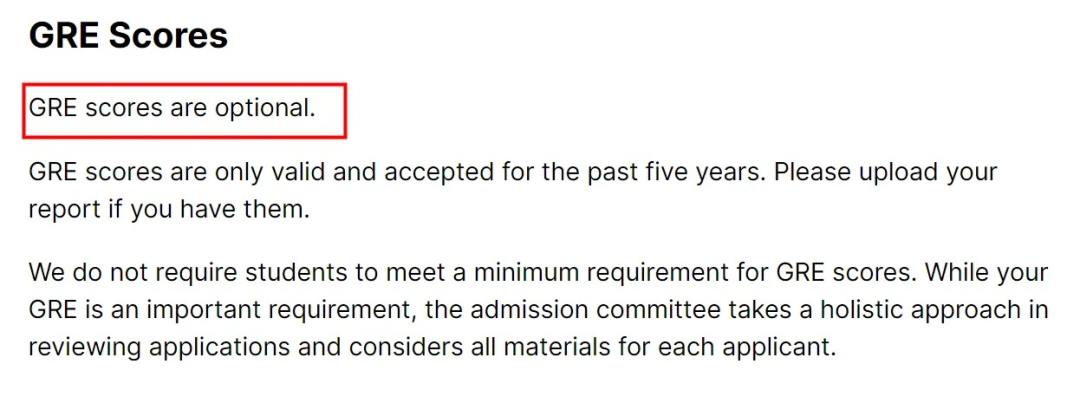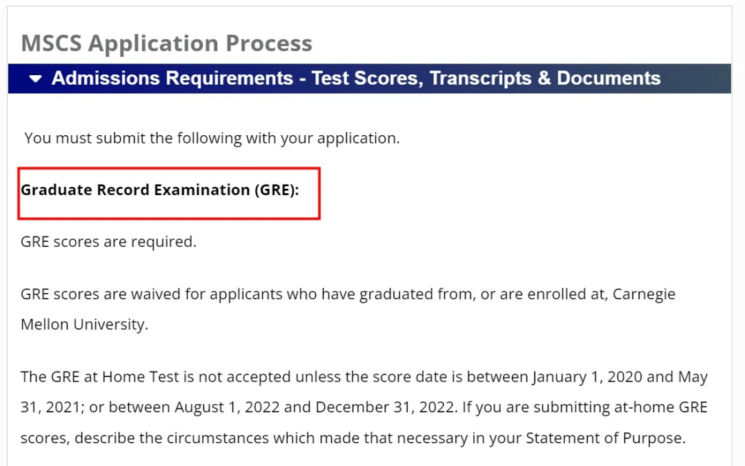 计算机科学硕士 (MSCS) 项目明确提出需要GRE成绩,且表明除非成绩日期在 2020 年 1 月 1 日至 2021 年 5 月 31 日之间;或 2022 年 8 月 1 日至 2022 年 12 月 31 日之间,否则不接受 GRE 在家考试。