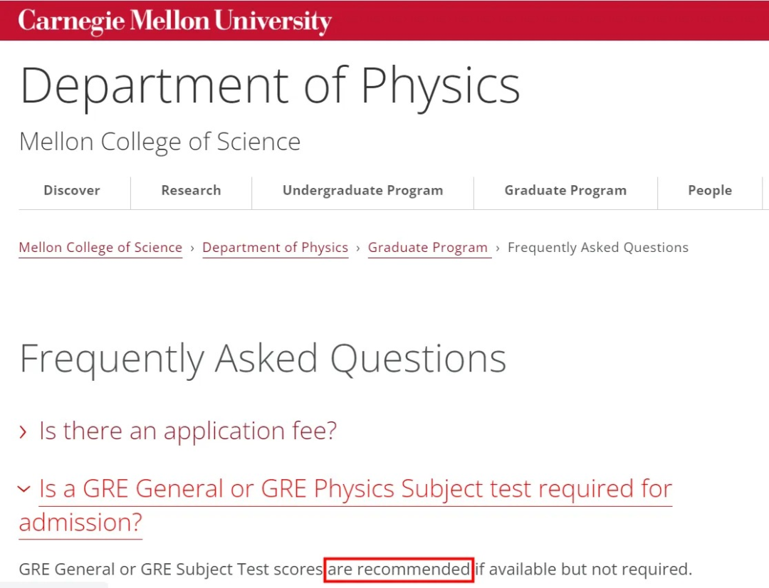 CMU的物理系强烈推荐提交GRE成绩以提高竞争力。