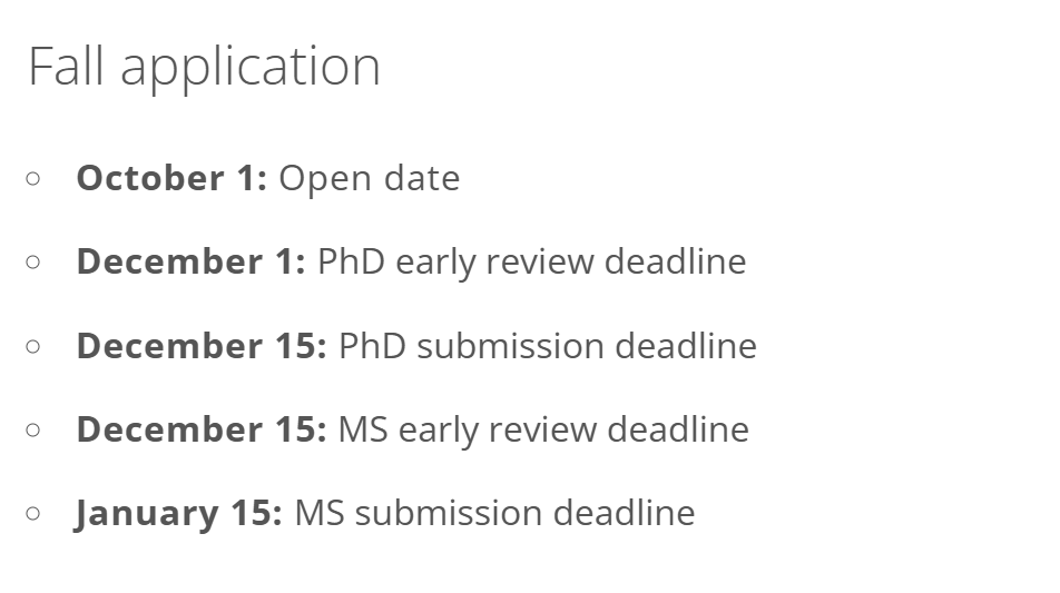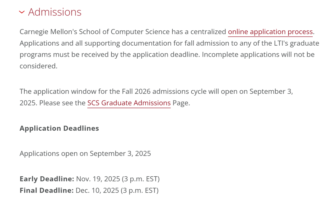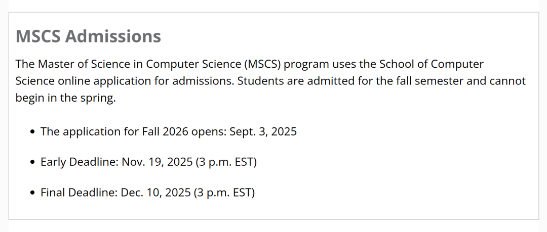 CMU的申请截止日期因项目而异。根据CMU官网提供的信息,计算机科学硕士 (MSCS) 项目申请于 2025 年 9 月 3 日开放。提前截止时间:2025 年 11 月 19 日(美国东部时间下午 3:00);最后期限:2025 年 12 月 10 日(美国东部时间下午 3:00)
