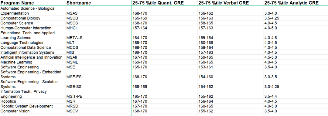 CMU的计算机科学学院(School of Computer Science,简称SCS)提供多种硕士项目,旨在培养学生在计算机科学及相关领域的高级技能和知识。其各个项目的GRE成绩汇总信息如下:
