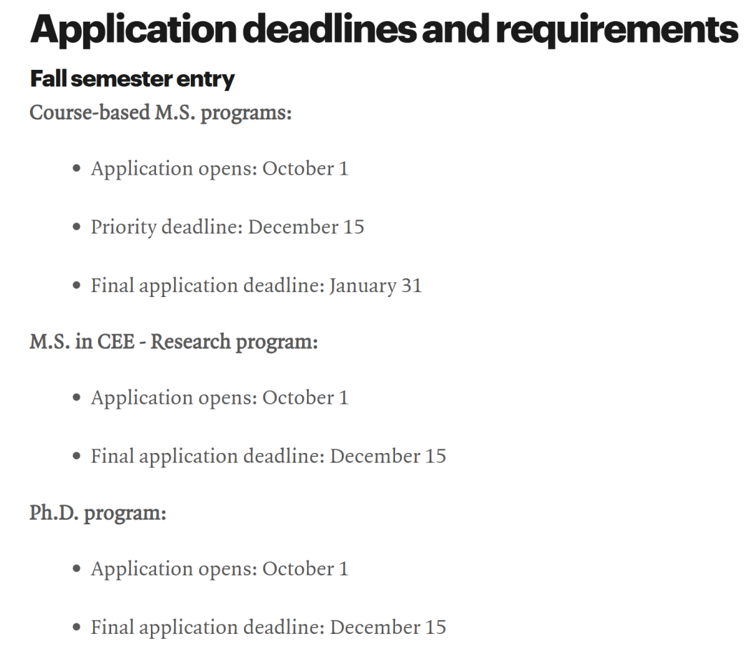 工程学院的土木与环境工程(Civil and Environmental Engineering,CEE)硕士项目2026 年秋季申请将于2025年10 月 1 日开始,最终申请截止日期为2025年12月 15日。