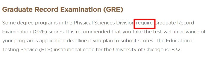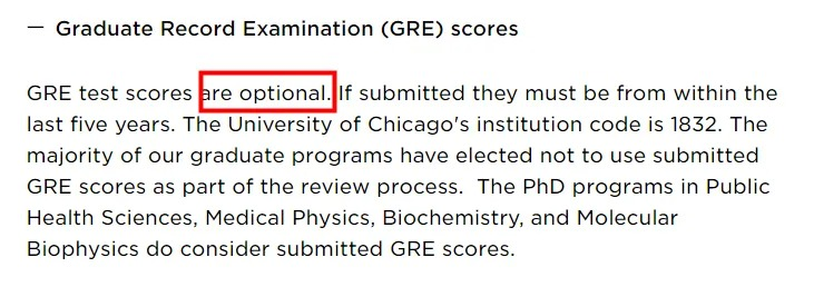 芝加哥大学生物科学学院(UChicago Biosciences)的GRE 成绩为可选项。如果提交了 GRE 成绩,它们必须是在过去五年内获得的。