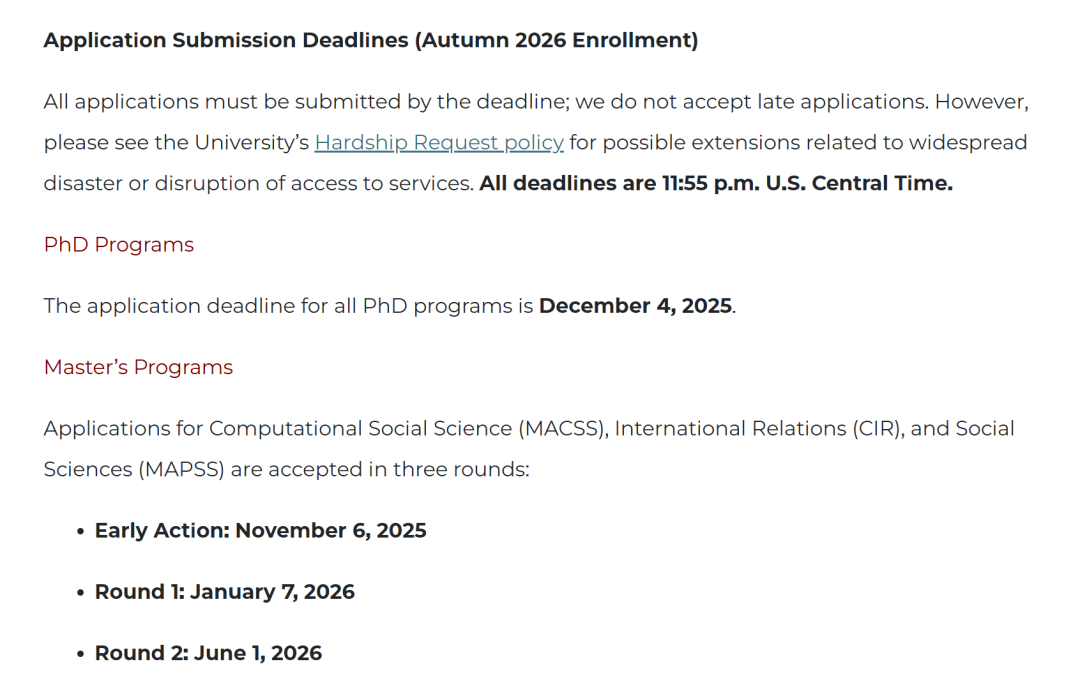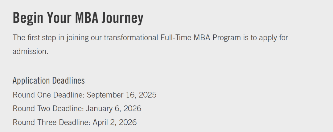 UChicago的申请截止日期因项目而异。根据UChicago官网提供的信息,商学院全日制 MBA 学生均于秋季入学,第一轮申请提交截止日期为2025年9月16日;第二轮提交截止日期为2026年1月6日;第三轮提交截止日期为2026年4月2日。