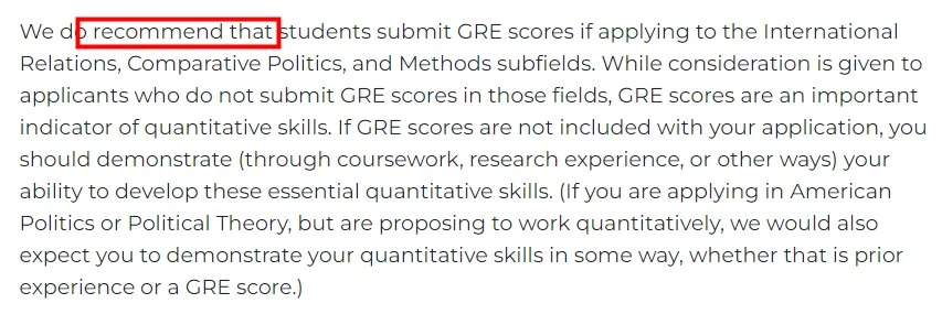 社会科学学院(Department of Political Science )GRE成绩是可选的。如果申请国际关系、比较政治和方法子领域(International Relations, Comparative Politics, and Methods subfields),建议学生提交 GRE 成绩。