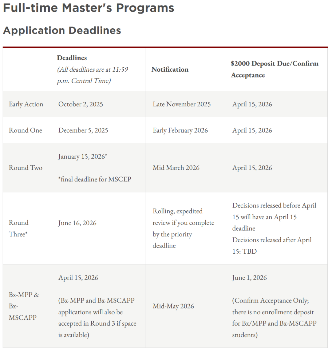 哈里斯公共政策学院(Harris School of Public Policy)的全日制硕士项目申请截止时间如下: