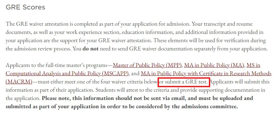 哈里斯公共政策学院(Harris School of Public Policy)的公共政策硕士 (MPP)、公共政策文学硕士 (MA)、计算分析和公共政策硕士 (MSCAPP)和公共政策文学硕士 (MACRM)必须提交GRE成绩。