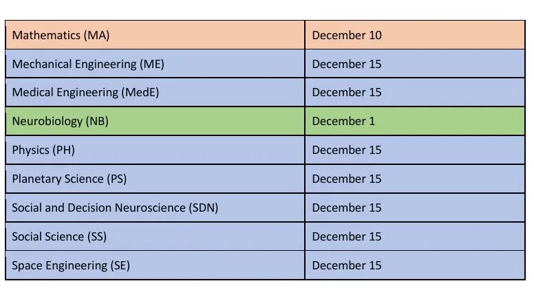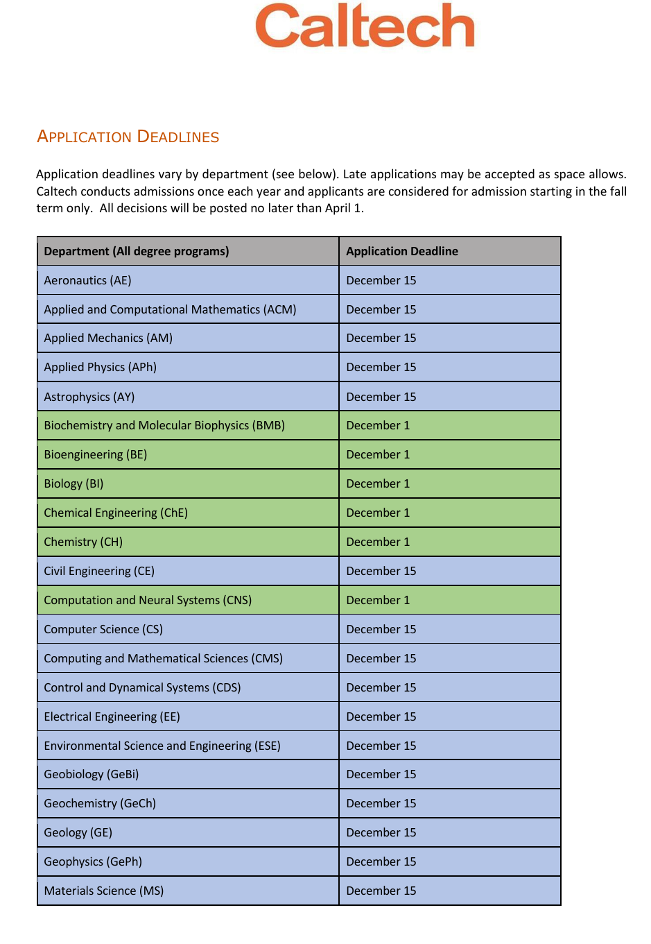 根据Caltech官网提供的信息,硕士项目的申请截止日期和要求因项目而异。具体如下: